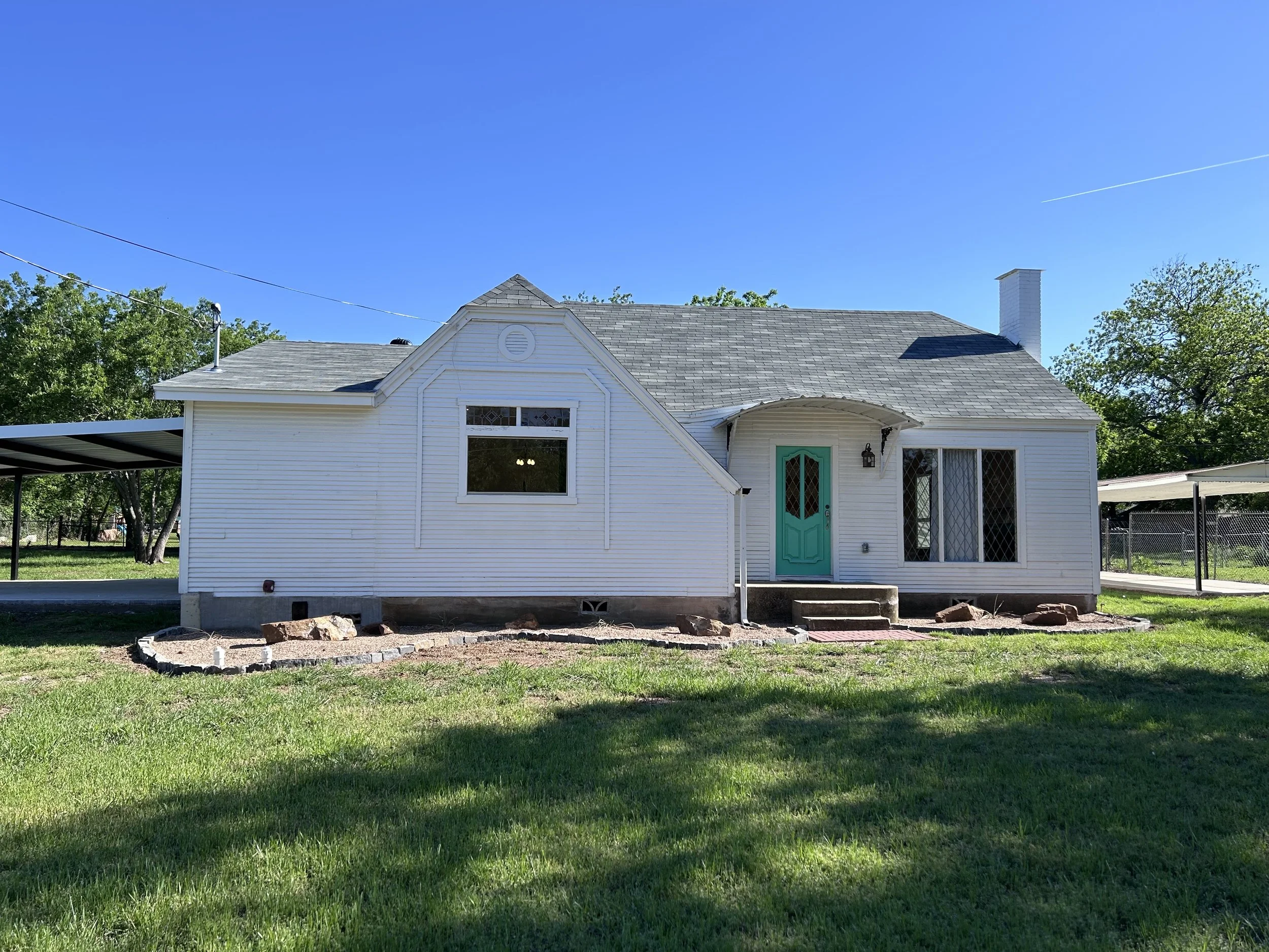 The inviting front entry of the home features a charming vintage door, freshly painted with a vibrant pop of color that immediately catches the eye. A covered porch extends warmly, offering shelter and a welcoming space to pause before entering. This combination of classic character and bright accents sets a friendly tone, making the entrance both distinctive and approachable.