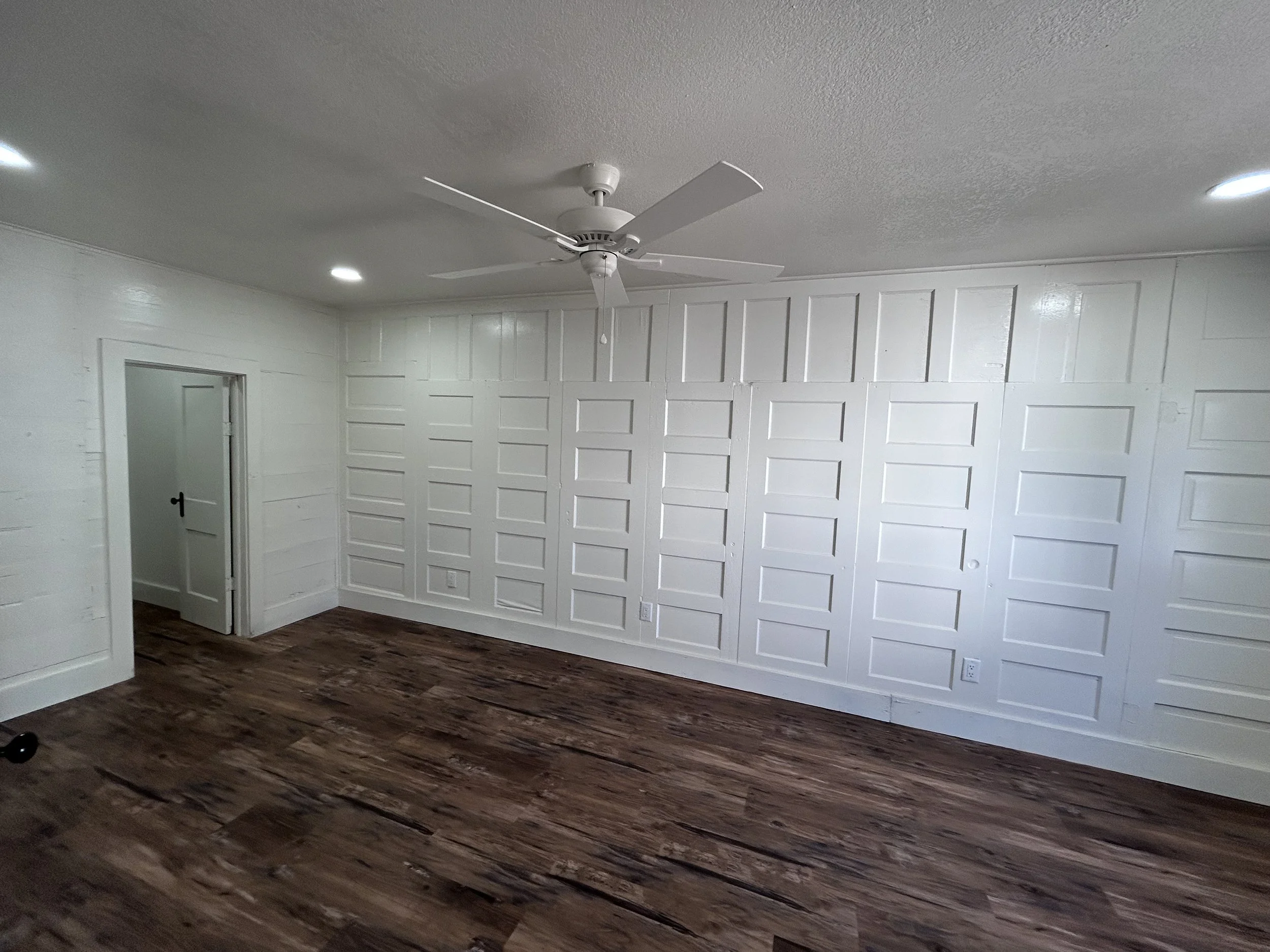 This spacious room features a large window that allows ample natural light to fill the space. A ceiling fan provides efficient air circulation for comfort. The room also includes a walk-in closet, offering generous storage space and organization options.