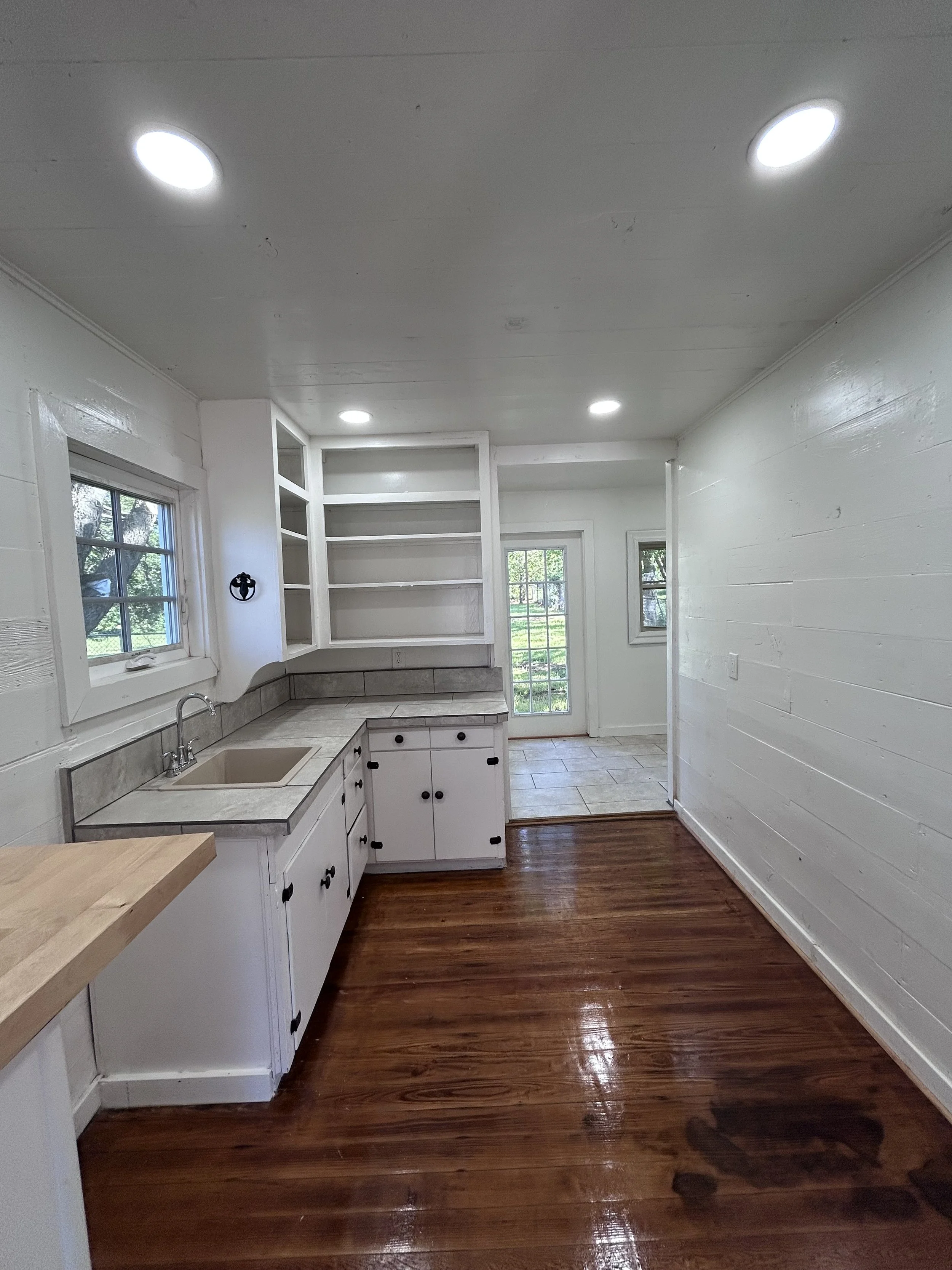 This kitchen features tons of cabinet storage, providing ample space to keep your essentials organized and within reach. The butcher block counters offer a warm, durable surface perfect for meal prep. A farmhouse sink adds a charming, rustic touch while accommodating large pots and pans with ease. The included dishwasher makes cleanup effortless.